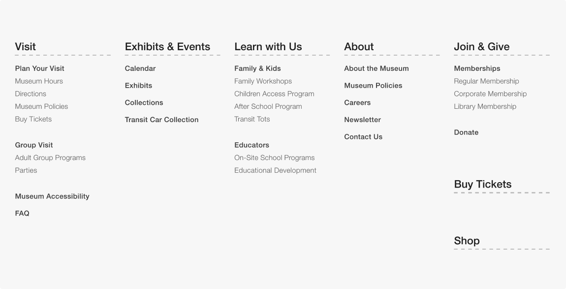 The NYTM website's navigation and organization system has been redesigned after three months of research, focusing specifically on the ticketing and membership page. This model has not been widely tested with users. In order to achieve an inclusive design, further tests and research should be conducted in the future.